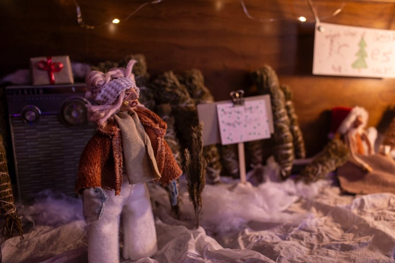 juxtaposed characters with qualities that present surreality rather than literal reality. dwelling in a renovated barbie dream-home made especially for them, each doll is curiously formed with paper clay, painted with handmade paints then adorned with naturally dyed textiles and other various repurposed or up-cycled materials. always finding themselves in precarious situations.