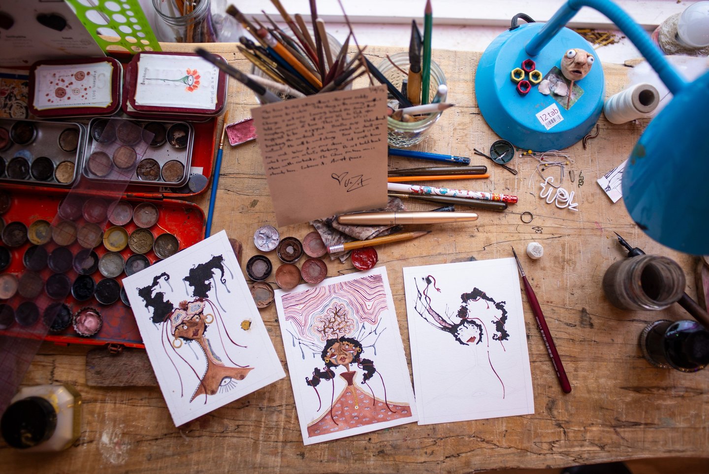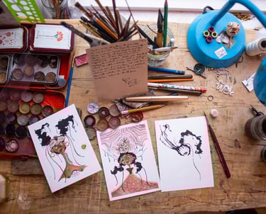 I am an Egyptian dreamweaver and multidisciplinary artist creating whimsical worlds through watercolor paintings, textiles, miniature doll-making and puppetry. My artistic perspective dances between dimensions, where my 2D watercolor paintings step gently off the page to become delicate 3D miniature dolls and marionettes. Both my paintings and sculptures feature juxtaposed characters with qualities that present surreality rather than literal reality. They are defined by my signature zippy paint splatters, botanical elements and disfigured anatomy that coexist together in harmony.